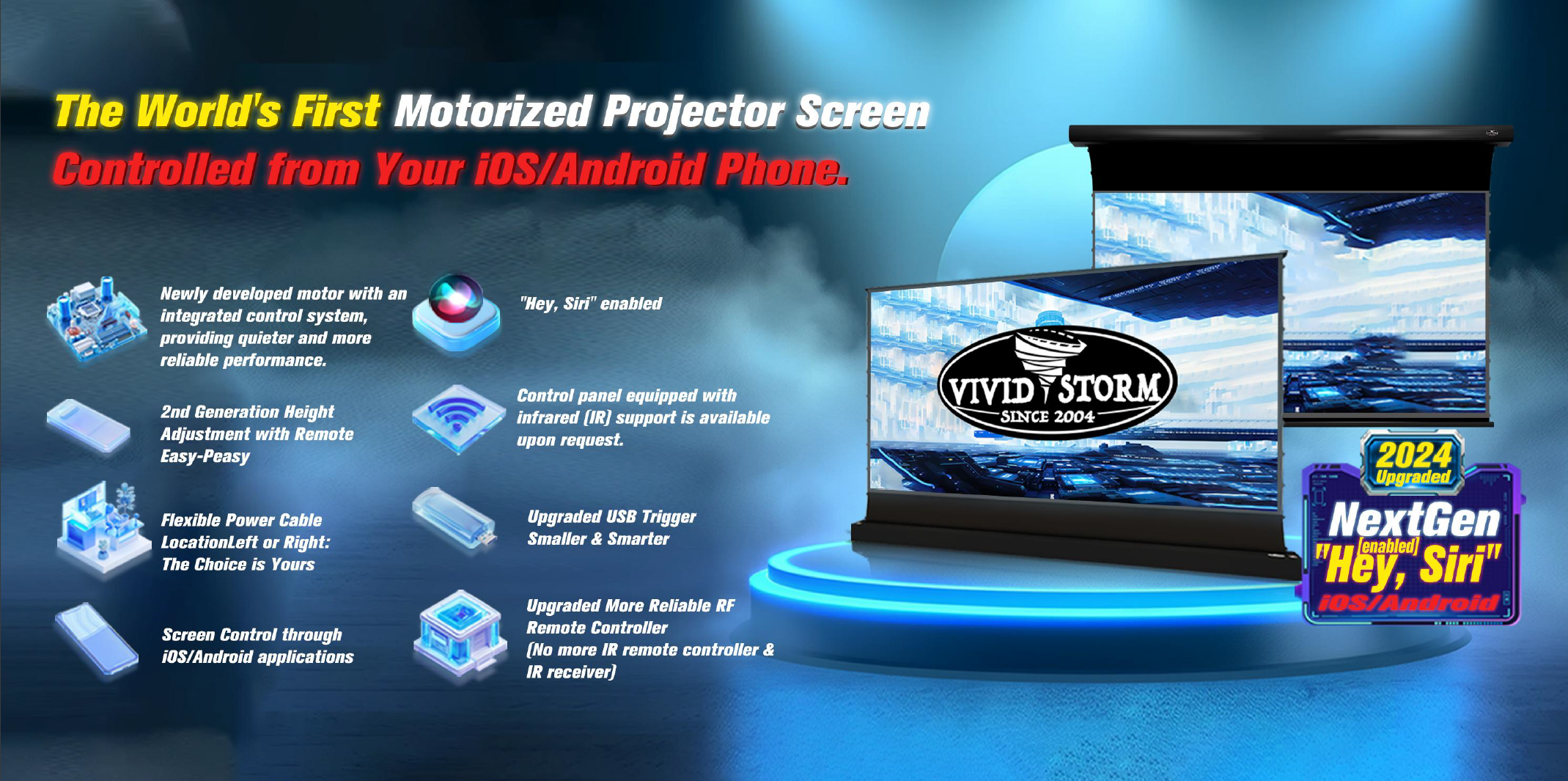 นอกจากนี้ VIVIDSTORM ยังให้ความสำคัญกับความยืดหยุ่นในการติดตั้ง เช่น จอเลื่อนขึ้นจากพื้น ที่ไม่ต้องใช้การเจาะผนังหรือเพดาน และจอ Motorized ที่ควบคุมง่ายผ่านรีโมท เทคโนโลยีที่เหนือชั้นนี้ทำให้ VIVIDSTORM ได้รับความไว้วางใจจากผู้ใช้งานทั่วโลก