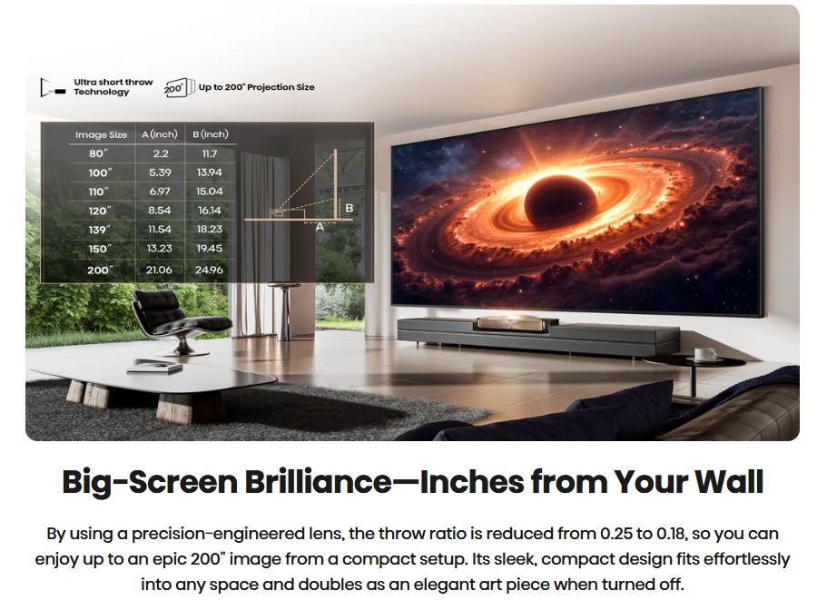 ด้วย Throw Ratio เพียง 0.18 สามารถฉายภาพได้ใหญ่ถึง 200 นิ้วจากระยะใกล้! ดีไซน์เพรียวบางทันสมัย เข้ากับทุกพื้นที่ และยังดูหรูหราเหมือนงานศิลปะเมื่อปิดเครื่อง