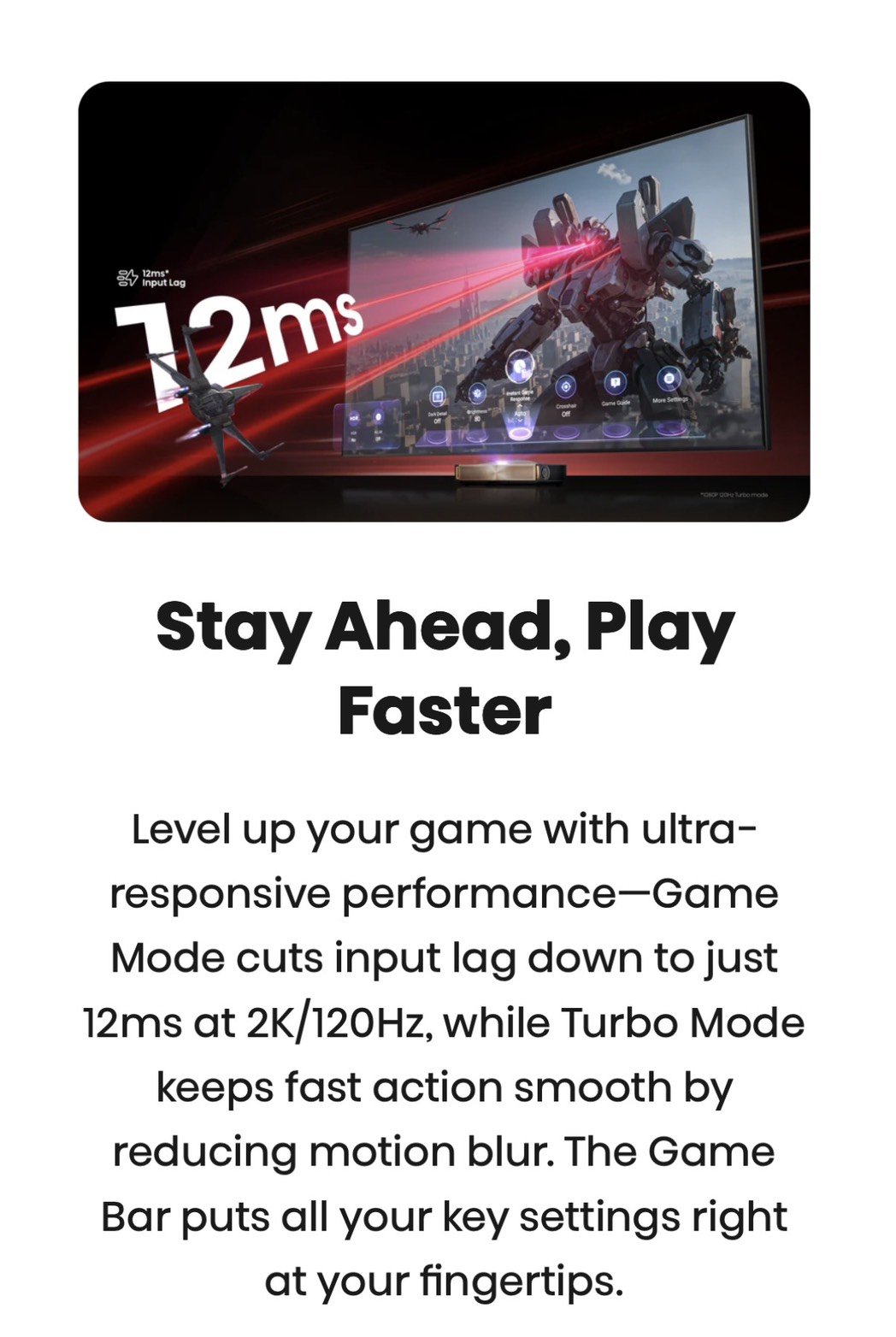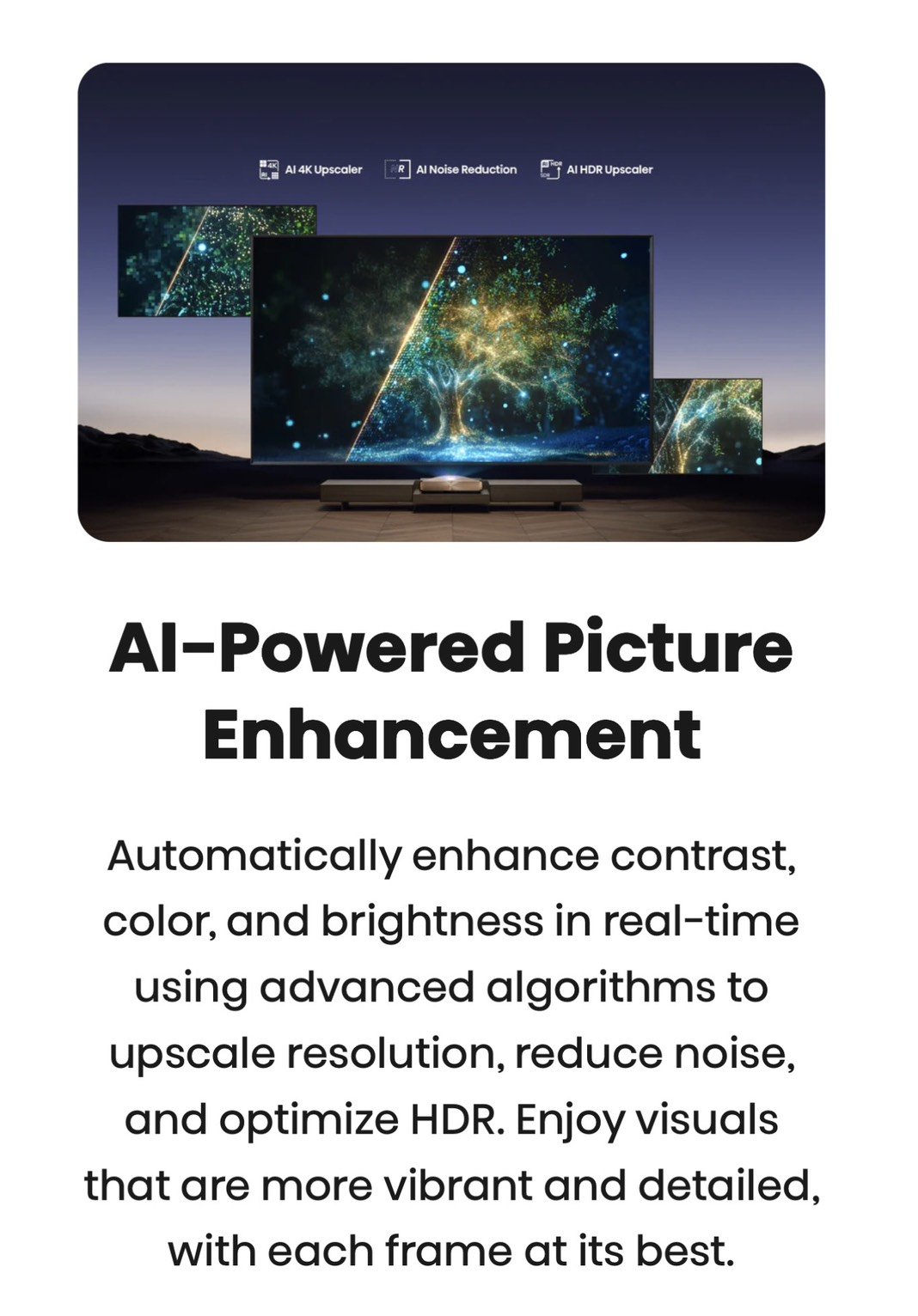 ขับเคลื่อนด้วยชิปเซ็ตประสิทธิภาพสูง ระบบเลเซอร์สามสี และเลนส์ความละเอียดระดับพรีเมียม ถ่ายทอดความสว่างและคอนทราสต์อันน่าทึ่ง พร้อมอัลกอริทึม Pro AI ที่ช่วยปรับแต่งภาพทุกเฟรมให้มีชีวิตชีวา สมจริงราวกับอยู่ในเหตุการณ์จริง