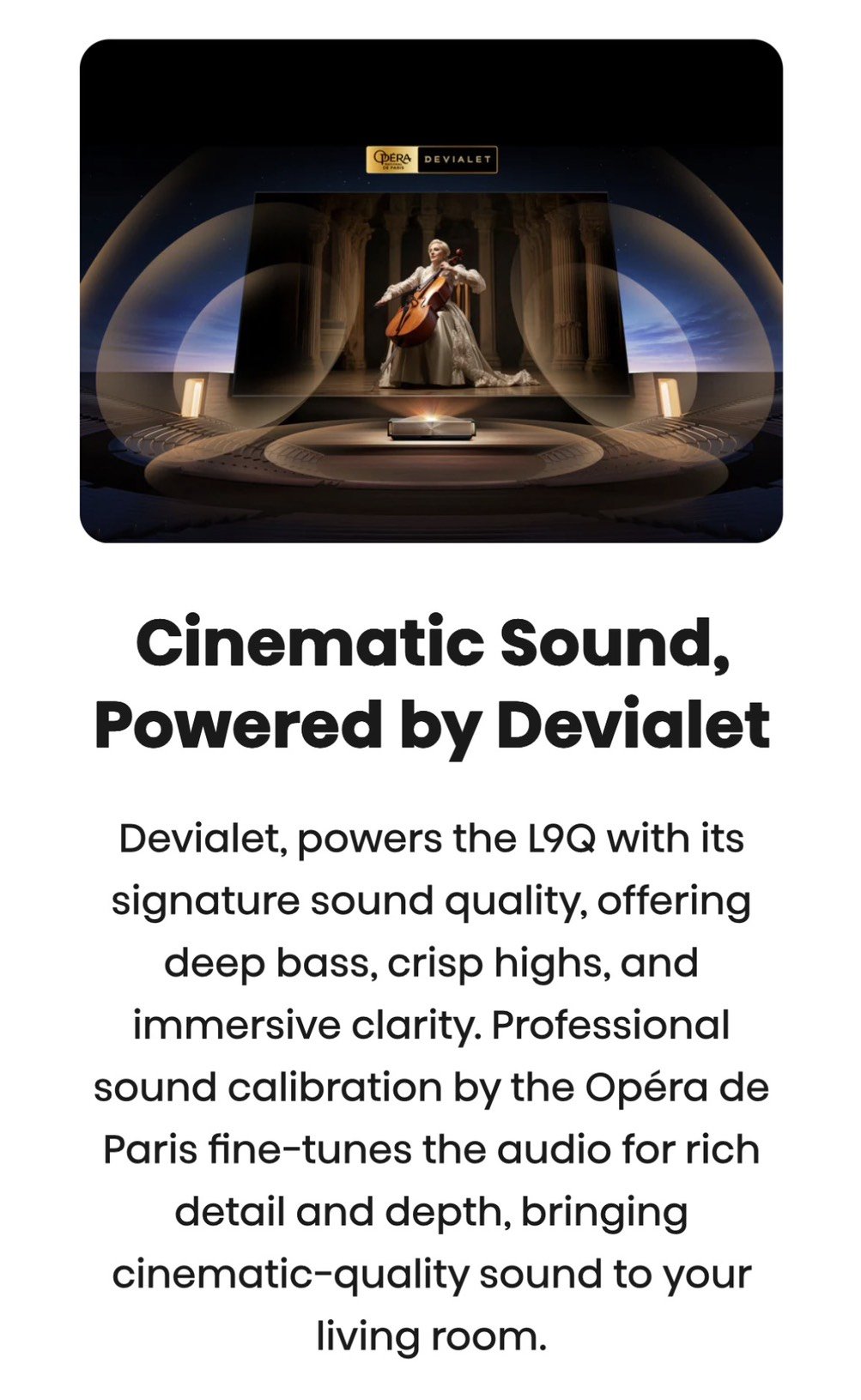 (พร้อมจำหน่าย กุมภาพันธ์ 2569) Hisense L9Q 4K Triple Laser Ultra Short Throw Projector ฉายได้ใหญ่สุดถึง 200" สุดยอดโปรเจคเตอร์ UST 4K สำหรับโฮมเธียเตอร์ขั้นเทพให้ภาพ 4K คมชัดด้วยเทคโนโลยี TriChroma™ ที่แสดงสี BT.2020 ได้ถึง 110% ครอบคลุมค่าสีเพิ่มขึ้นจากรุ่นก่อนถึง 3% มาพร้อม Dolby Vision, IMAX Enhanced และระบบเสียง Devialet พร้อมกับ Dolby Atmos ที่ทำให้การรับชมทั้งภาพและเสียงสมจริงเหมือนอยู่ในโรงภาพยนตร์ ระบบปฏิบัติการ VIDAA มาพร้อม app สตรีมมิ่ง Netflix, Disney+ และอื่น ๆ รวมถึงการเล่นเกมและกีฬาแบบรีเฟรชเรทสูง ตอบโจทย์ทั้งการชมภาพยนตร์และความบันเทิงในบ้าน