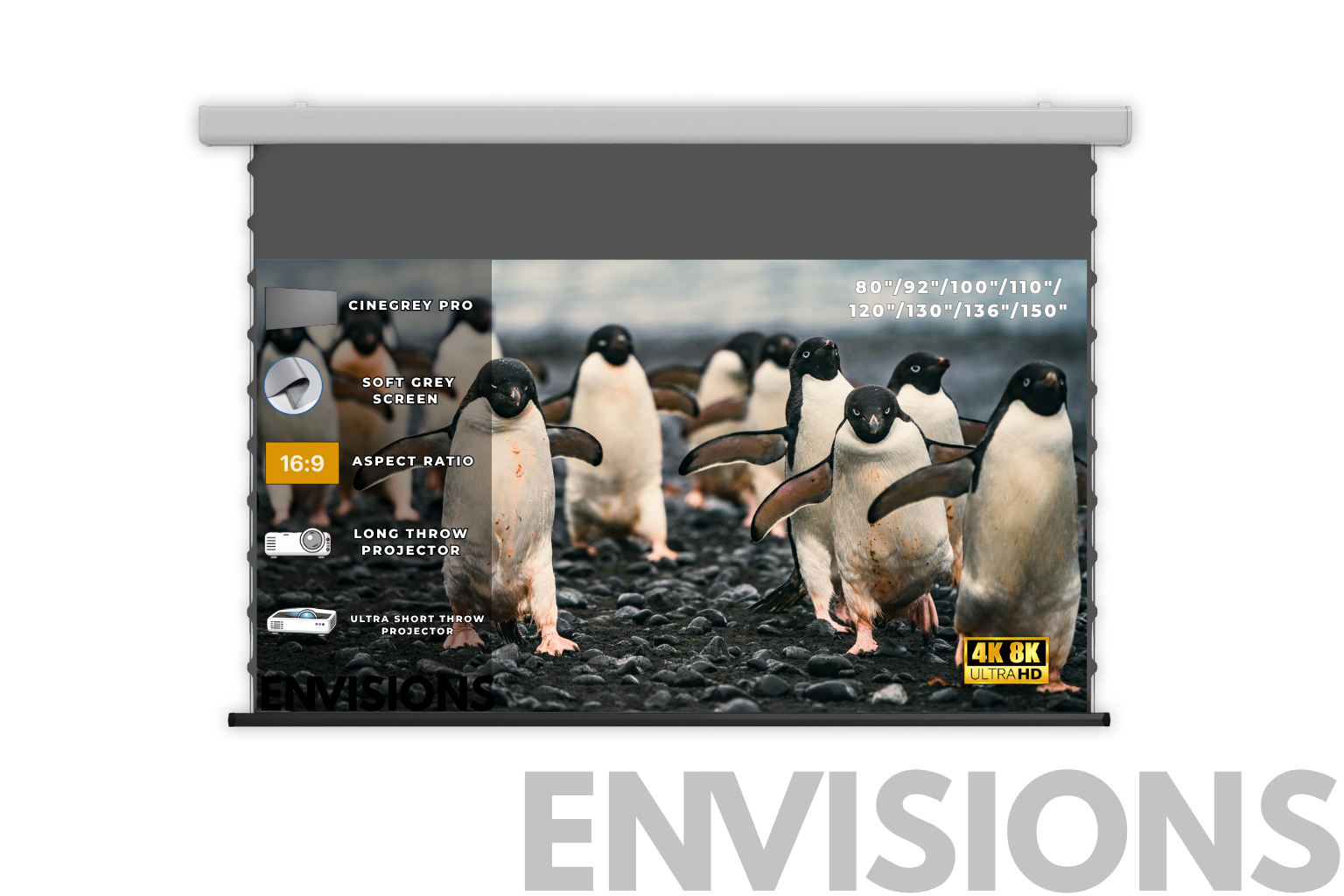 จอโปรเจคเตอร์แบบ Drop Down ที่ใช้ผิวจอ CineGrey Pro ช่วยเพิ่มความเข้มของภาพและคอนทราสต์ ทำให้ภาพดูมีมิติมากขึ้น รองรับการใช้งานได้ทั้ง Ultra Short Throw และ Long Throw เหมาะสำหรับทั้งบ้านและพื้นที่ใช้งานทั่วไป